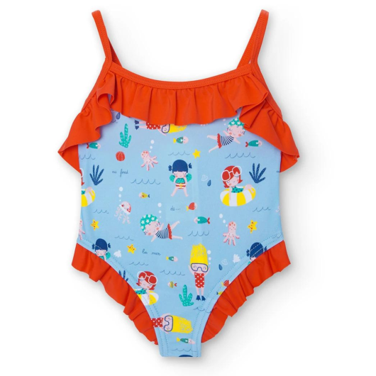 Questo grazioso costume da bagno intero da bambina ha un design caratterizzato da un vivace stampato su un tessuto di punto, perfetto per l’estate. Il colore predominante è un azzurro chiaro che evoca il cielo estivo. Questo costume da bagno è ideale per le piccole che amano giocare e divertirsi in acqua, facile da indossare e comodo, è l’ideale per le giornate in spiaggia o in piscina.