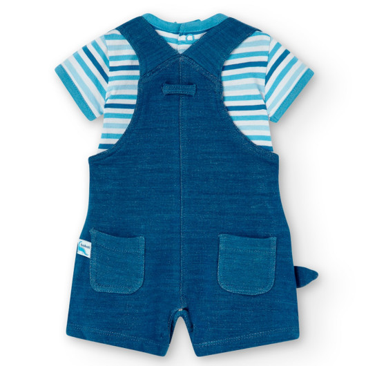 Pack bimbo composto da body e salopette. Il body è a maglia liscia con righe nei toni del blu; si chiude con bottoni a pressione. La salopette è in pile denim elasticizzato ed è decorata con un dinosauro ricamato nei toni del blu. Ha l’etichetta con dettaglio della marca.