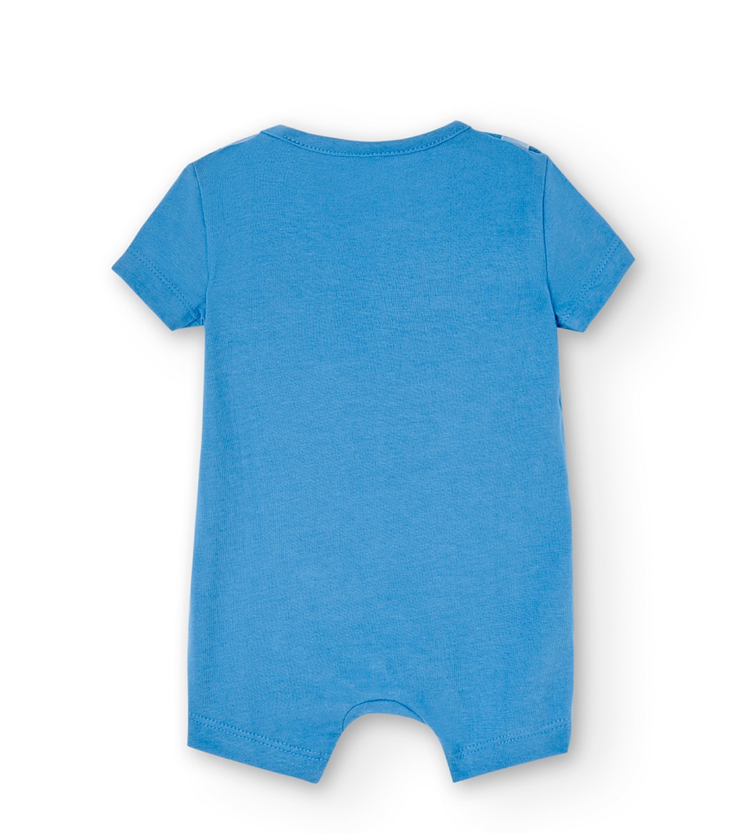 Pagliaccetto a maglia liscia da bimbo di colore blu con applicato un dinosauro nei toni del blu. Si chiude con bottoni a pressione sulle spalle e nell’interno cosce.