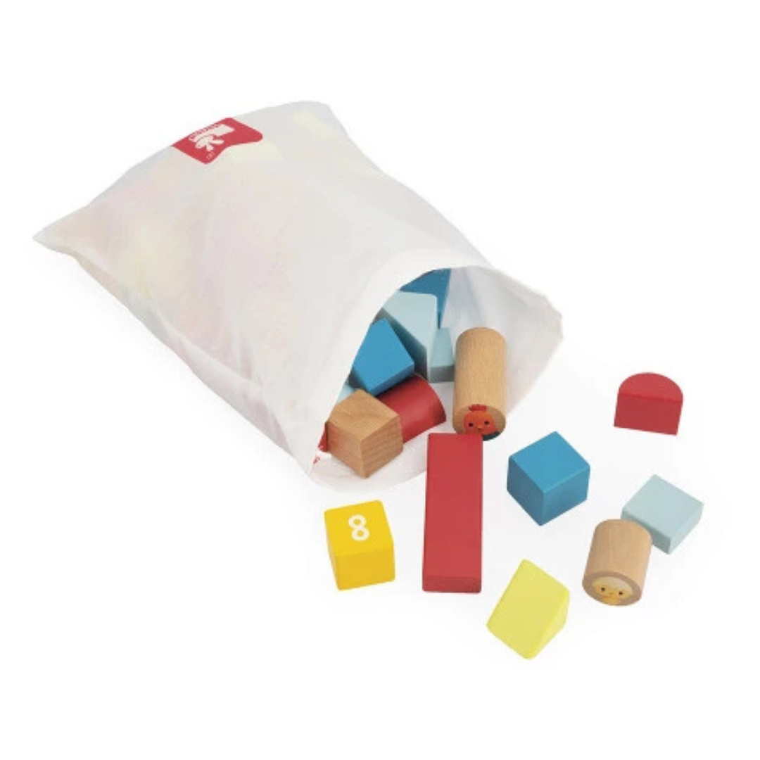Un giocattolo educativo che stimola le capacità motorie e l’immaginazione dei più piccoli: cerchi, quadrati, triangoli, ponti… le possibilità di costruzione sono infinite. I bambini impilano i pezzi e si divertono a costruire gli elementi della loro fattoria: fienili, recinti o pollai. E a volte, tutto cade! Ma che divertimento! Ma non è tutto: il contenitore fustino nasconde anche delle belle sorprese! Tra i pezzi ci sono illustrazioni di animali da fattoria: una gallina, un gallo e due adorabili pulcini. È perfetto per inventare storie! Questo gioco è anche progettato per crescere con il tuo bambino: lo accompagna nel suo apprendimento grazie ai cubi numerati da 0 a 9, permettendogli di familiarizzare con i numeri e imparare a contare divertendosi. Ancora più giocoso, il barile funge anche da raccoglitore di forme grazie al suo coperchio tagliato per adattarsi alle forme dei pezzi. I bambini imparano a riconoscere le forme, a manipolarle e a posizionarle correttamente. Consegnati con una borsa di cotone, i pezzi sono facili da riporre e trasportare.