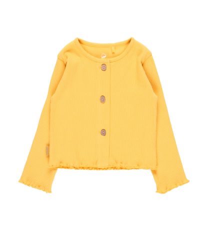 Giacca in cotone biologico per bambina a costine color giallo senape, con chiusura frontale a bottoni. La decorazione? Un’etichetta con dettaglio del marchio.