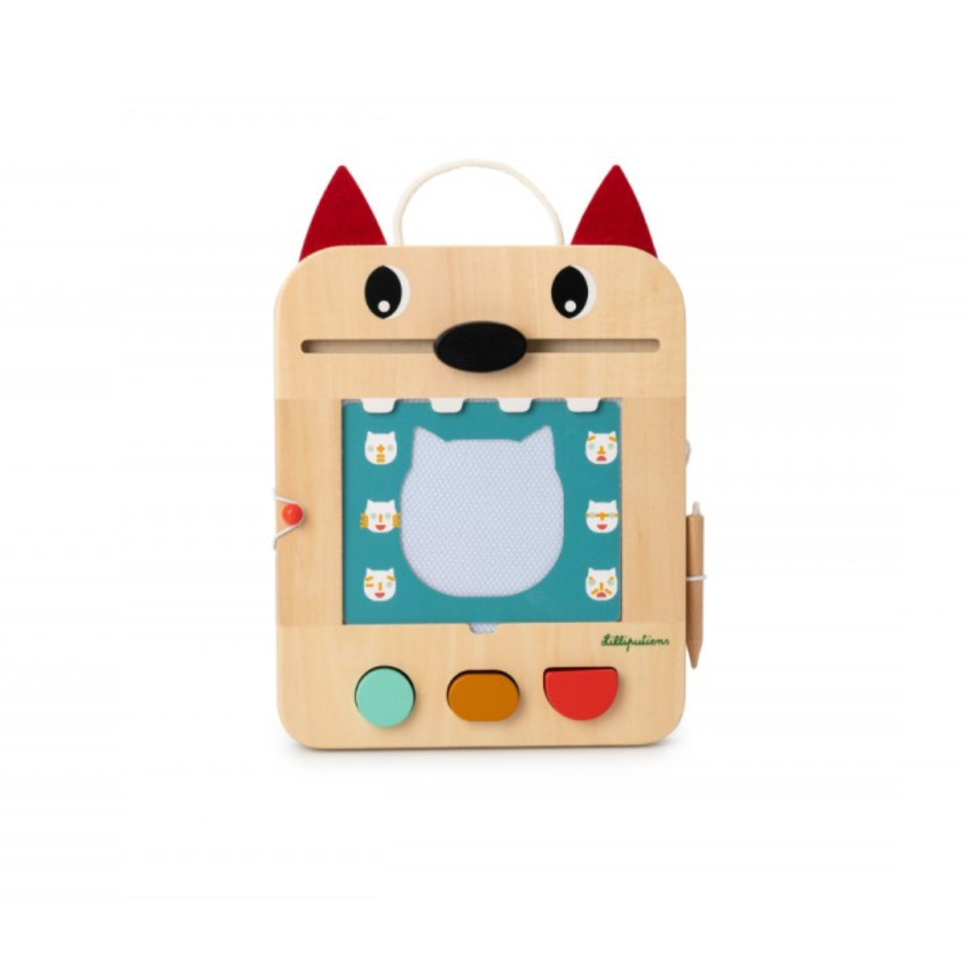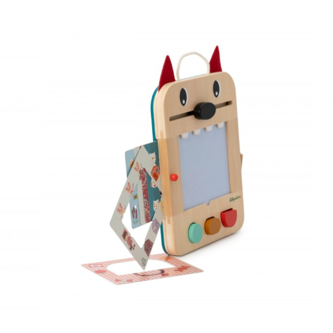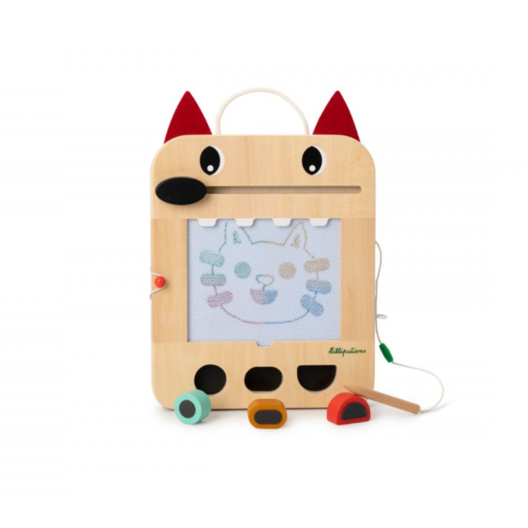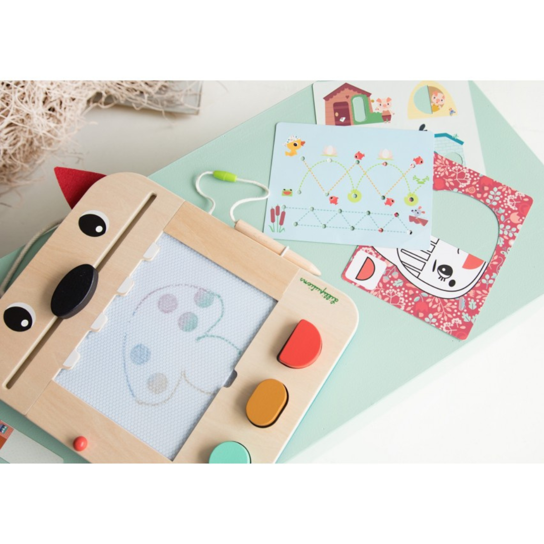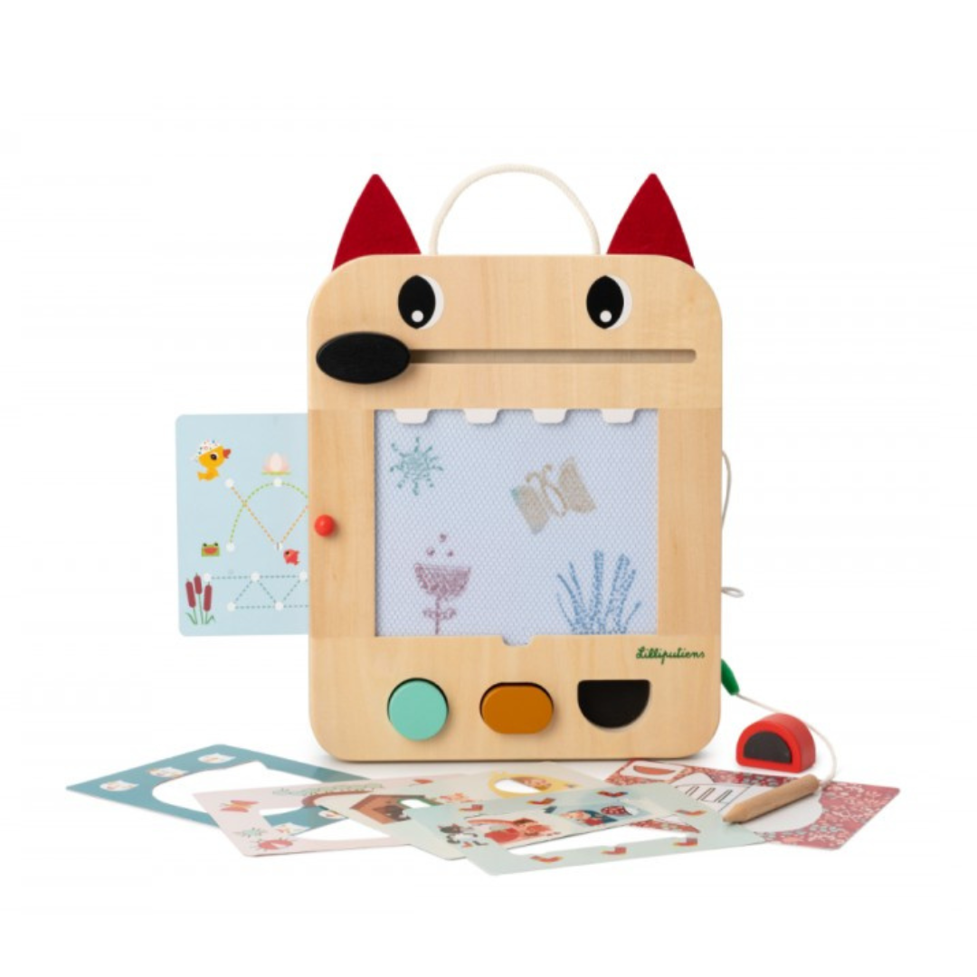 Questa lavagna magica di Lilliputiens offre infinite possibilità di disegno e gioco. Grazie ai suoi colori diversi, 3 timbri con forme geometriche, 6 carte con 12 giochi e una matita di legno, stimola la manualità e la creatività dei più piccini. E poi, se hai commesso un errore o vuoi creare un nuovo disegno, niente panico: il naso di Louis cancella. Le schede da gioco sono riposte nell’apposito alloggiamento sul retro e la matita di legno è fissata con un cordino per evitare di perderla.