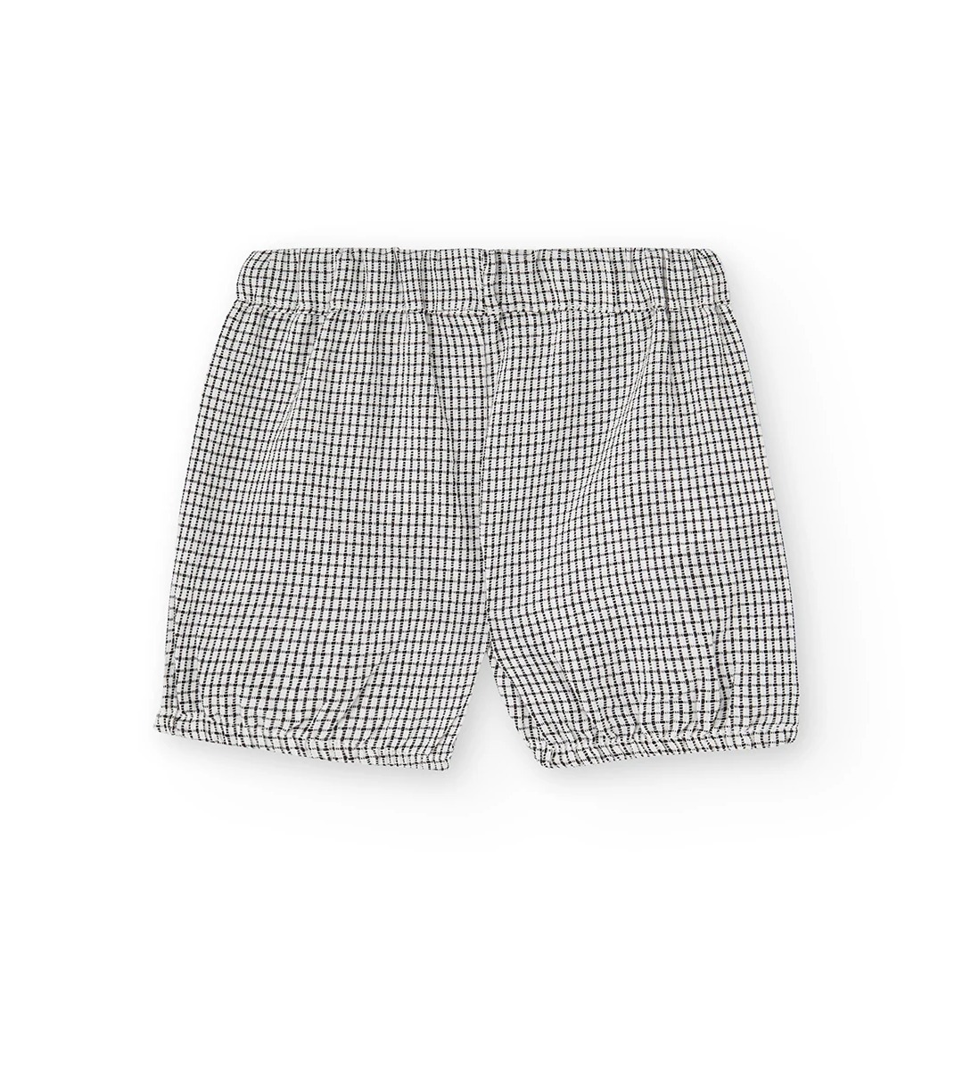Pack composto da maglietta e short da bimbo. La maglietta è a maglia liscia color arancione con un elefante al centro; si chiude con bottoni a pressione sulla spalla. I pantaloni sono in tessuto fantasia a quadri bianchi e grigi; regolabili con elastico e coulisse; hanno l’etichetta con dettaglio della marca.