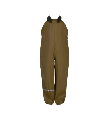 La salopette cerata da pioggia a tinta unita CeLaVi in poliestere riciclato hanno bretelle elastiche regolabili ed è dotata di cinghie sotto-piede elastiche e regolabili.