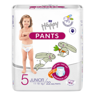 Happy Pants è il nuovissimo pannolino a mutandina che assicura un cambio facile e veloce, si indossa proprio come una mutandina e si rimuove velocemente grazie alla pratica apertura a strappo laterale easy off. Il design moderno offre un eccellente assorbimento ed una perfetta vestibilità al corpo del bambino,  creando comfort durante i movimenti e durante il sonno. Le mutandine hanno una cintura elastica particolarmente morbida in vita che assicura una perfetta aderenza senza stringere. Progettate per essere indossate e tolte molto facilmente, i pannolini a mutandina Happy aiutano il bambino a passare senza difficoltà la fase dello spannolinamento.  Le mutandine Happy hanno una tecnologia del flusso d’aria che le rendono traspiranti mantenendo sempre asciutta la pelle del bambino. Lo speciale tessuto non tessuto accelera la distribuzione dell’umidità su tutta la superficie delle mutandine e fornisce una sensazione di asciutto.