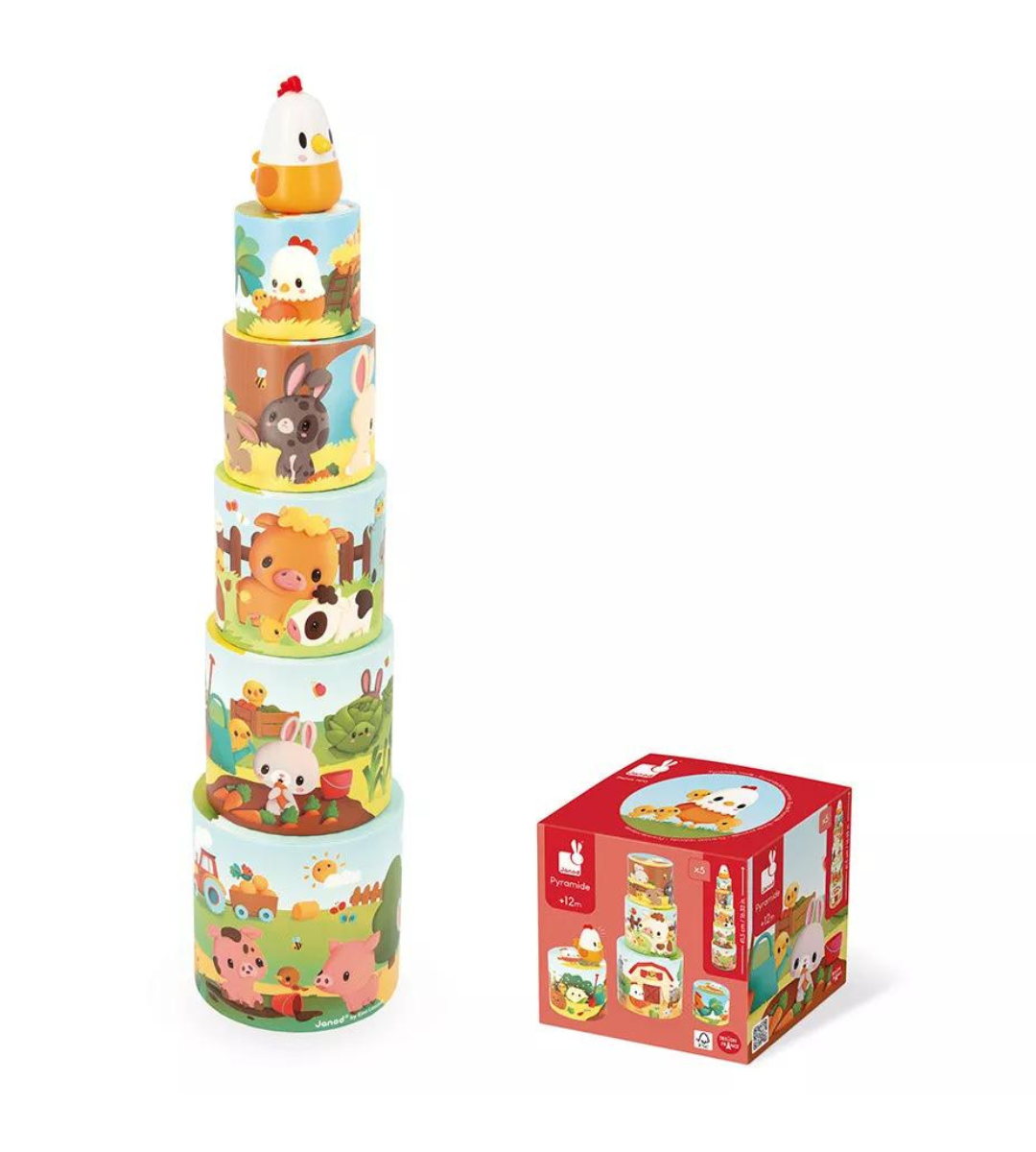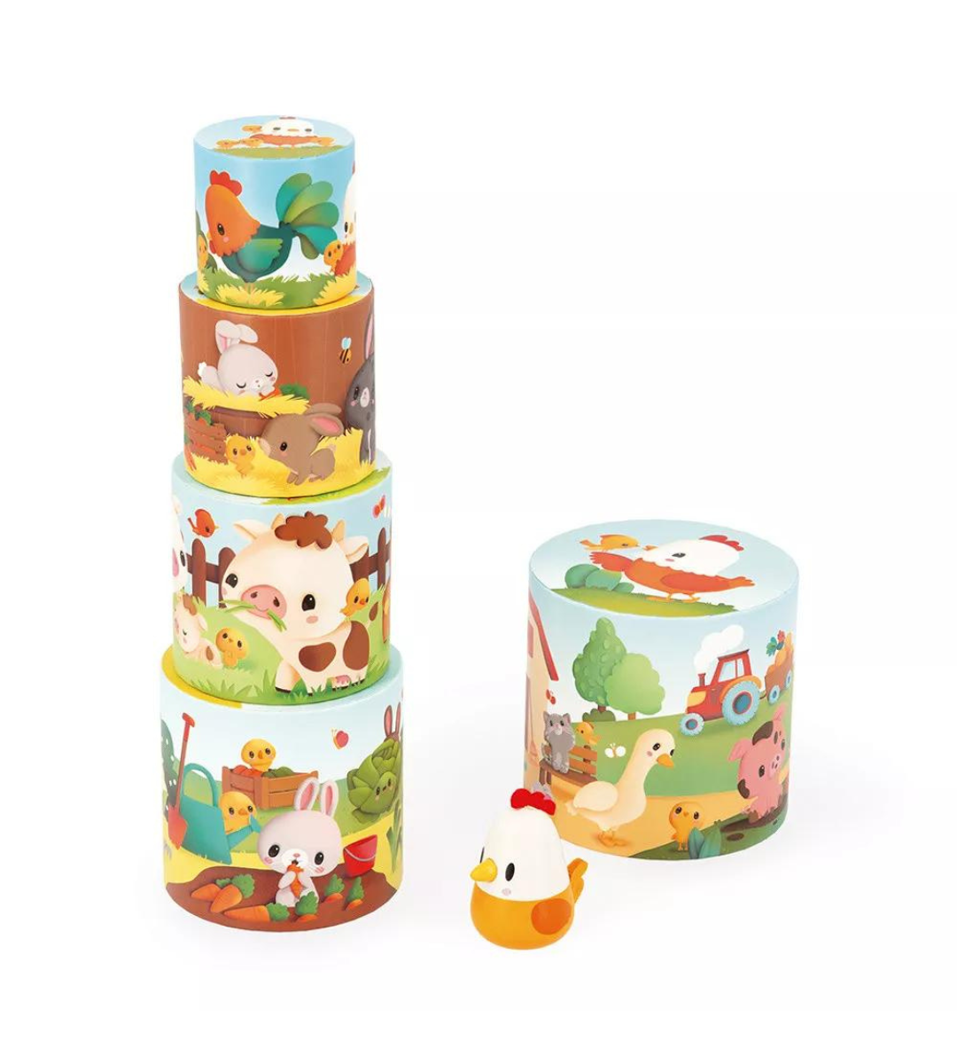 Un gioco che include 5 cilindri e 1 statuina in legno da impilare per sviluppare le abilità motorie, l’equilibrio e il vocabolario, dai 12 mesi in su. Sul tema della fattoria, le 5 forme che compongono la piramide sono riccamente illustrate: maiali, mucche, conigli, polli. È inclusa anche un adorabile statuina in legno: è mamma gallina, impegnata a ritrovare i suoi pulcini che sono andati a esplorare la fattoria. È possibile nascondere la gallina sotto le forme e chiedere al bambino di ritrovarla, oppure stimolarlo a individuare tutti i pulcini illustrati!