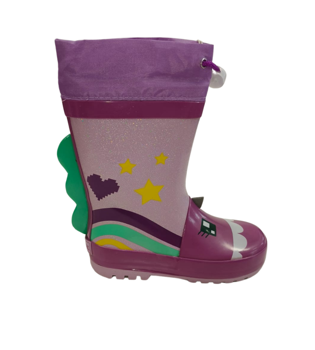 Stivali da pioggia color lilla e rosa da bambina, dal design con un simpatico dinosauro che aggiunge un tocco di colore ai giorni di pioggia. Hanno dei dettagli in rilievo come creste sul tallone, un bellissimo arcobaleno, due occhi espressivi verso l’alto e dei simpatici dentoni davanti. La parte superiore ha un pratico cordoncino regolabile a coulisse che offre allo stivale una maggiore protezione contro l’acqua, mentre la suola antiscivolo assicura stabilità su superfici bagnate.