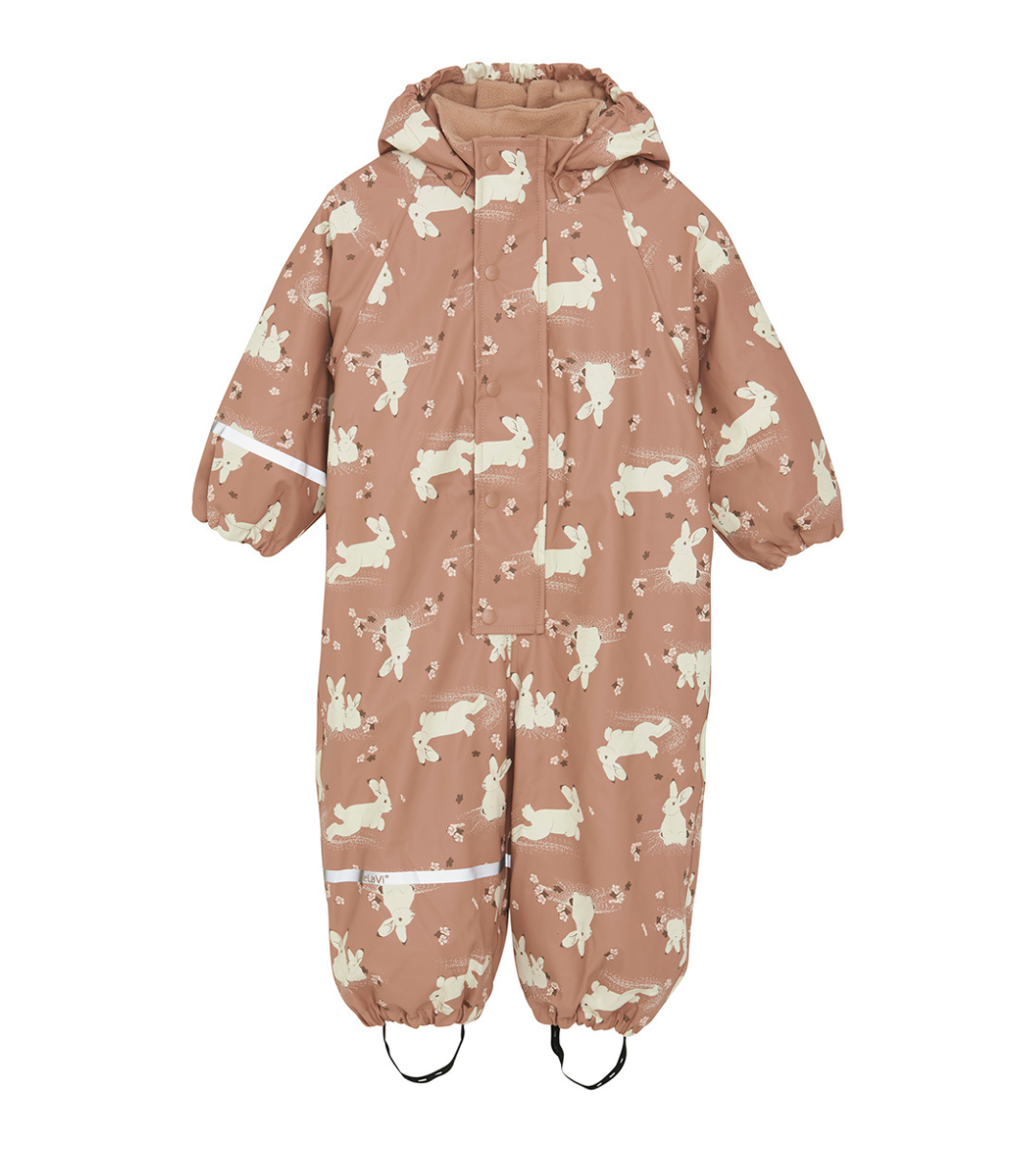 Elegante tutona antipioggia di un bel marrone fulvo con stampa all-over di simpatici coniglietti che giocano in mezzo a tanti fiorellini. La tuta antipioggia ha dettagli riflettenti attorno alla manica destra e alla gamba destra e logo riflettente sulla manica sinistra e sul cappuccio.