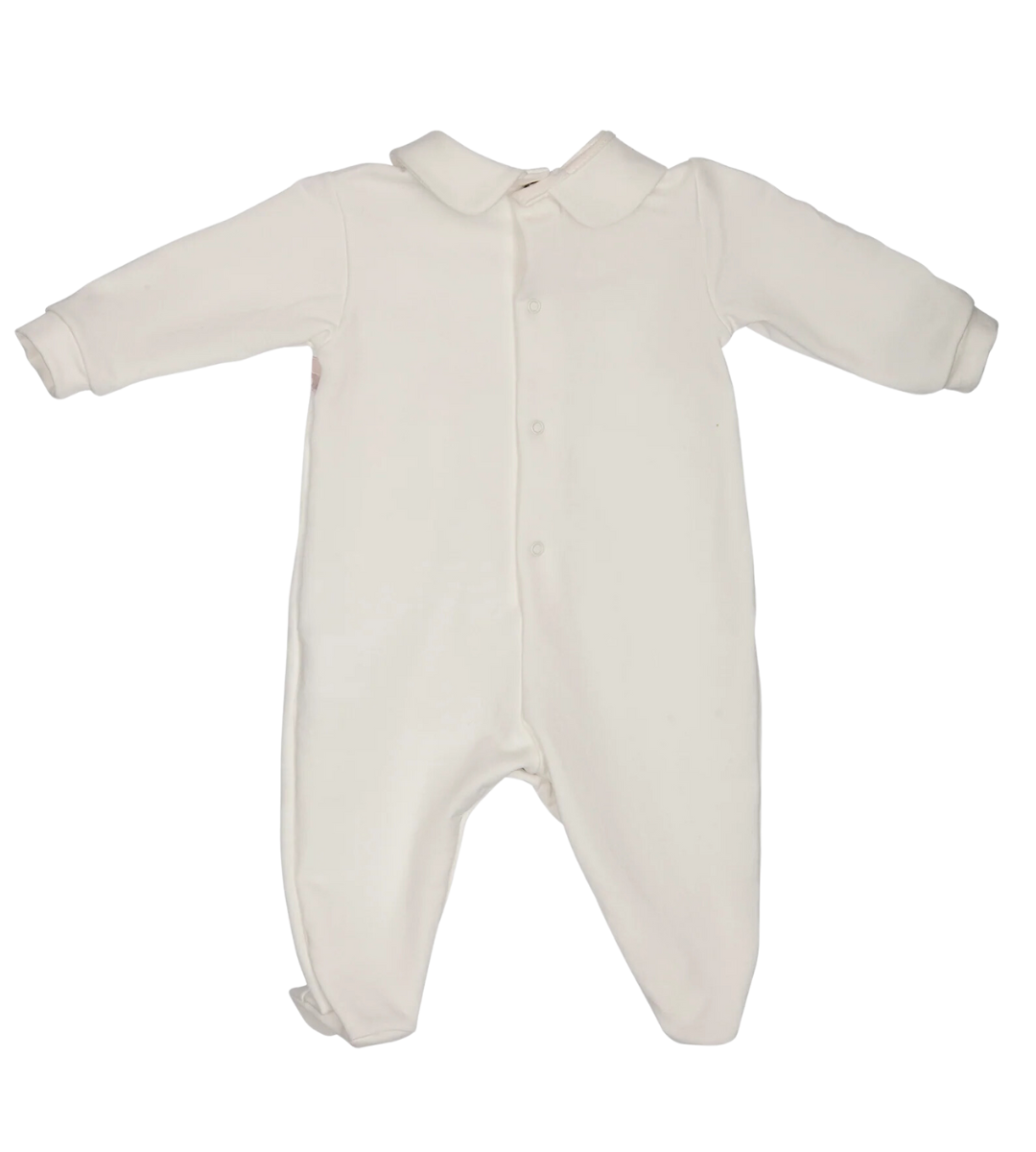 Tutina in felpa da neonata arricchita da una fascia in vita con un fiocchetto con motivo floreale. Bottoncini sul cavallo e sul retro per facilitare la chiusura.