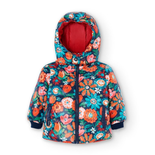 Giubbotto da bambina reversibile in tessuto tecnico, con chiusura a zip e cappuccio rimovibile con zip, con fondo irregolare, più lungo sulla schiena con piccola apertura. Un lato è completamente stampato con un motivo sul fondo blu marino e fiori in diversi colori effetto acquarello, con polsini e tasche in canneté elastico color blu marino. Come decorazione ha un’etichetta del brand. L’altro è color rosso aranciato con grandi tasche sul davanti e una piccola banda in canesú color blu marino. I polsini sono color rosso aranciato con filo color blu marino. Come decorazione ha una piccola stampa sul braccio destro e un’etichetta del brand decorativa